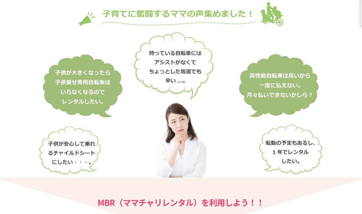 この記事は、子育て中の方を対象に、子供乗せ電動自転車のレンタルサービス『MBR(Mom’s Bike Rental)』がなぜ最適なのかをわかりやすく説明していきます。